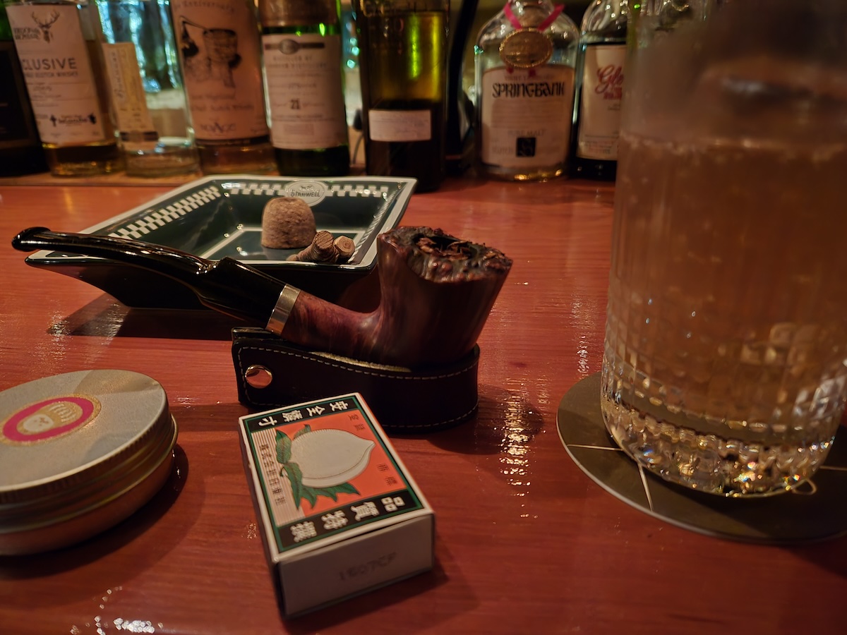 私は最初の一杯目にギムレットを頼み(飲んだことないので)、パイプ用の灰皿を出してもらい、しかるのちパイプレストを取り出して組み立て目の前に置き、次にパイプを取り出す。パイプ煙草はコーネル&ディールのバイユーモーニング。煙草葉を百均のアルミ缶(化粧品用)に詰めて持ってきているので、とりだして開き、パイプに葉をちょいちょいと詰めた。詰め終わったらアルミ缶はかばんに戻し、タンパーを用意してからパイプをくわえる。ようやくマッチをすって火を付ける。すぱすぱとボウルの中に火を巡らせて一服。この一連の手順をゆっくり出来る時間が無いとパイプは吸えないね。